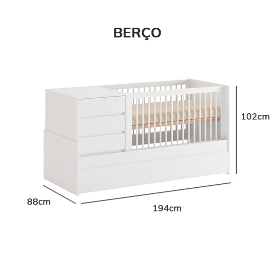 | MEDIDAS | Medidas Berço: Altura: 102cm Largura: 88cm Profundidade: 194cm Medidas Cama: Altura 55cm Largura: 88cm Profundidade: 194cm Medidas Nicho: Altura 67cm Largura: 23cm Profundidade: 58cm Medidas Escrivaninha: Altura 73cm Largura: 69cm Profundidade: 138cm |