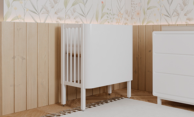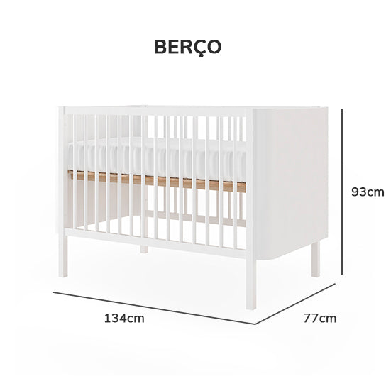 O Berço Nord Branco é multifuncional. Seu estilo nórdico e atemporal combinado ao design sustentável são marcados pelos cantos arredondados e elegantes e pode ser usada para quarto de bebê de menino e menina com um estilo mais moderno e sofisticado.