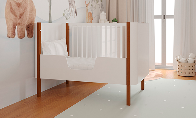 O Berço Nord Branco Com Pé Jequitibá é multifuncional. Seu estilo nórdico e atemporal combinado ao design sustentável são marcados pelos cantos arredondados e elegantes e pode ser usada para quartos de bebês de menino e menina com um estilo mais moderno e sofisticado.