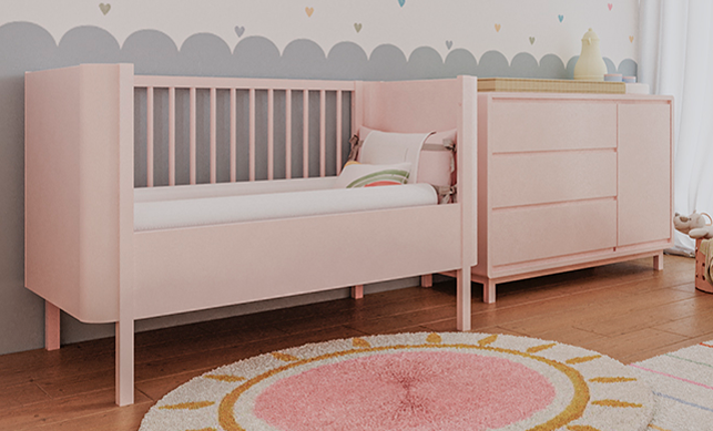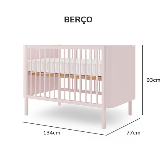 O Berço Nord Rosa é multifuncional. Seu estilo nórdico e atemporal combinado ao design sustentável são marcados pelos cantos arredondados e elegantes e pode ser usada para quartos de bebês meninas com um estilo mais moderno e sofisticado.