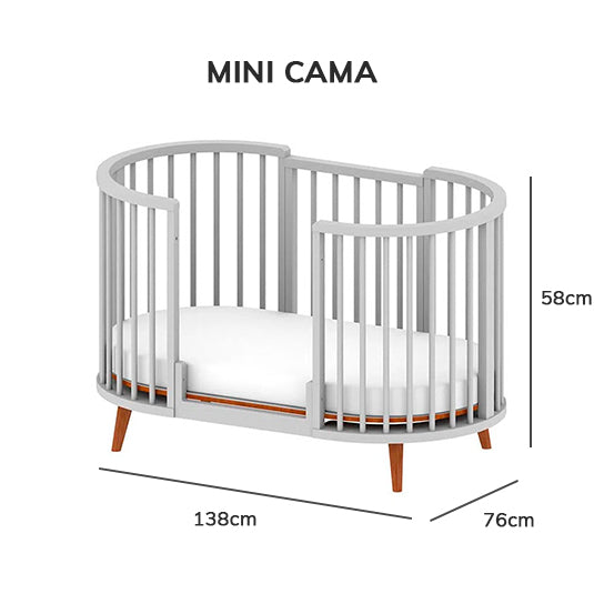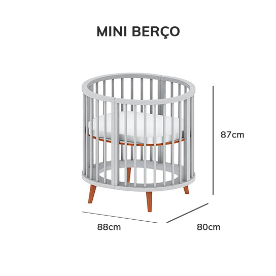 | MEDIDAS | Mini berço: Altura: 87cm Largura: 88cm Profundidade: 80cm Berço: Altura: 87cm Largura: 80cm Profundidade: 138cm |