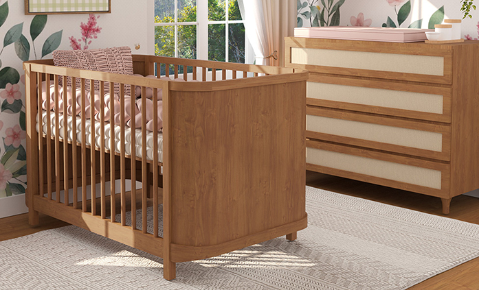 O Berço Raika 3 em 1 Fechado Freijó une design moderno e funcionalidade para acompanhar todas as fases do bebê. Seu modelo fechado com cantos arredondados traz um visual elegante e acolhedor, perfeito para compor quartos modernos. Características do produto: