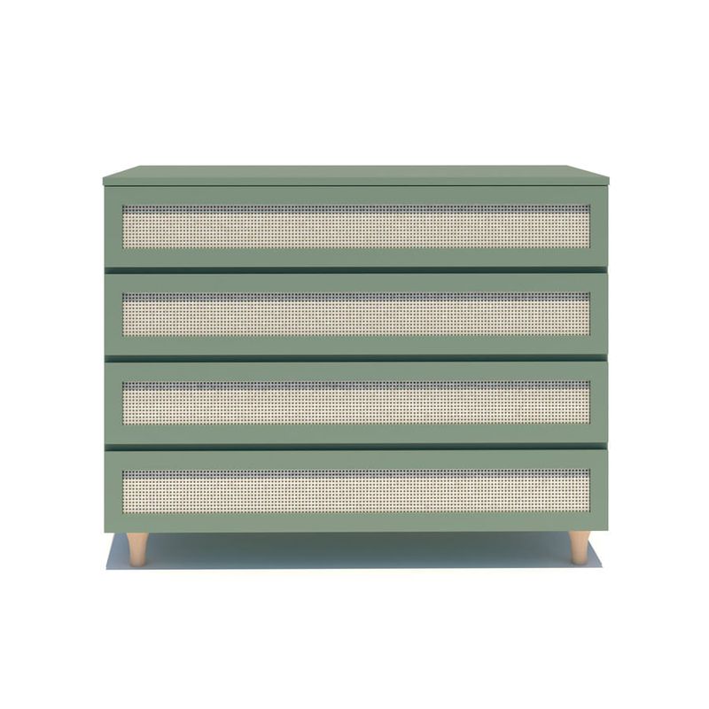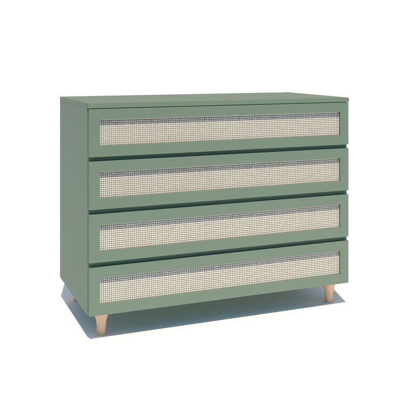 A Cômoda de Bebê Haus Nature Verde Jardim com Palha 110cm tem linhas retas com pé carvalho, palhas em tom natural e design boho chic. Pode ser usado para quartos de menino e menina com um estilo moderno ou vintage. Possui: