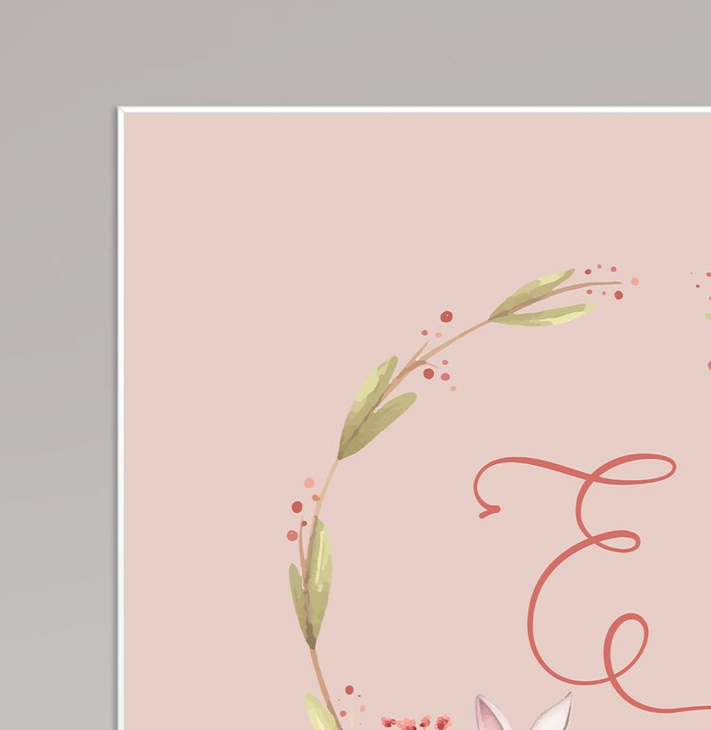 O Quadro Infantil Guirlanda com Inicial Secrets Rosa - Personalizado possui fundo rosa com guirlanda de folhas, flores e coelho aquarela com inicial centralizada. Ideal para transformar e decorar o ambiente, essa peça deixará o quarto da bebê ainda mais belo e autêntico!