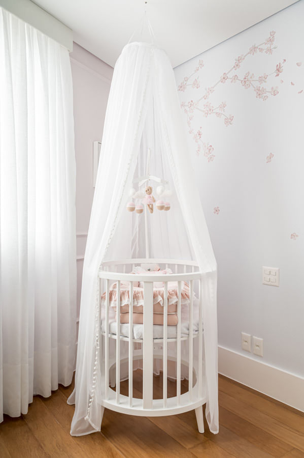 O Quarto com temática angelical da Chiara foi desenvolvido pensando em transmitir uma atmosfera doce e delicada com paleta em tons leves entre branco, bege e rosa. O papel de parede floral com galhos de cerejeira traz memórias afetivas especiais para a família, além de contribuir, juntamente com os quadros da coleção Anjinhas, para a decoração dos sonhos dos papais Edson e Karin! O Berço Slim possui desing oval e é muntifuncional com 4 opções de montagem, podendo se adaptar e acompanhar todas as fases da bebê. A Cômoda Viena possui altura ideal para troca e profundidade equivale à de um armário, com linhas retas e pés palitados. Para acompanhar e trazer ainda mais conforto para a mamãe no momento da amamentação, temos a Poltrona Slim com puff e sistema de balanço que ajudará a ninar a bebê. O enxoval do quarto é da coleção Tressê confeccionado com bordados, rendas e babados super delicados!
