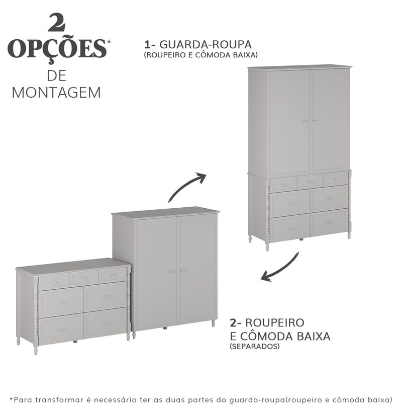 Este roupeiro faz parte da linha Monet, com design atemporal e romântico, ideal para quartos sofisticados e afetivos.